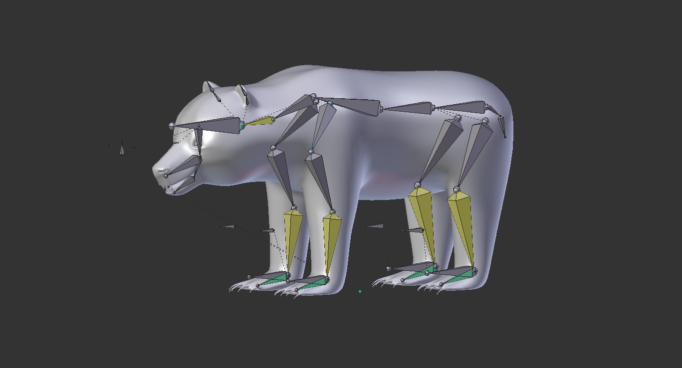 Nadat ik het modellen en texturen had afgerond, ben ik bezig gegaan met het riggen van mijn beer. Met riggen zet je een soort van skelet in je model waarmee je, later bij het animeren, je model kan bewegen. De rig kan je zo simpel of zo ingewikkeld maken als je zelf wilt. Ik heb gekozen om mijn rig niet al te ingewikkeld te maken, omdat het alleen maar voor een loop animatie was en niet iets heel moeilijks.