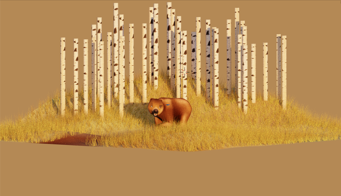 Toen het riggen klaar was, kon ik eindelijk beginnen met het animeren. Alleen een loop animatie is natuurlijk een beetje saai. Dus nadat ik mijn loop animatie had afgerond, en ik nog tijd over had, heb ik nog een vlinder toegevoegd die om de beer heen vliegt. Dit was erg leuk om te maken, omdat de beer hierdoor wat meer gaat leven en meer een karakter krijgt. Ik heb om alles nog wat meer af te maken er nog een kleine scene omheen gemaakt, zodat het allemaal wat meer sfeer krijgt. En dit is het uiteindelijke resultaat na een week: